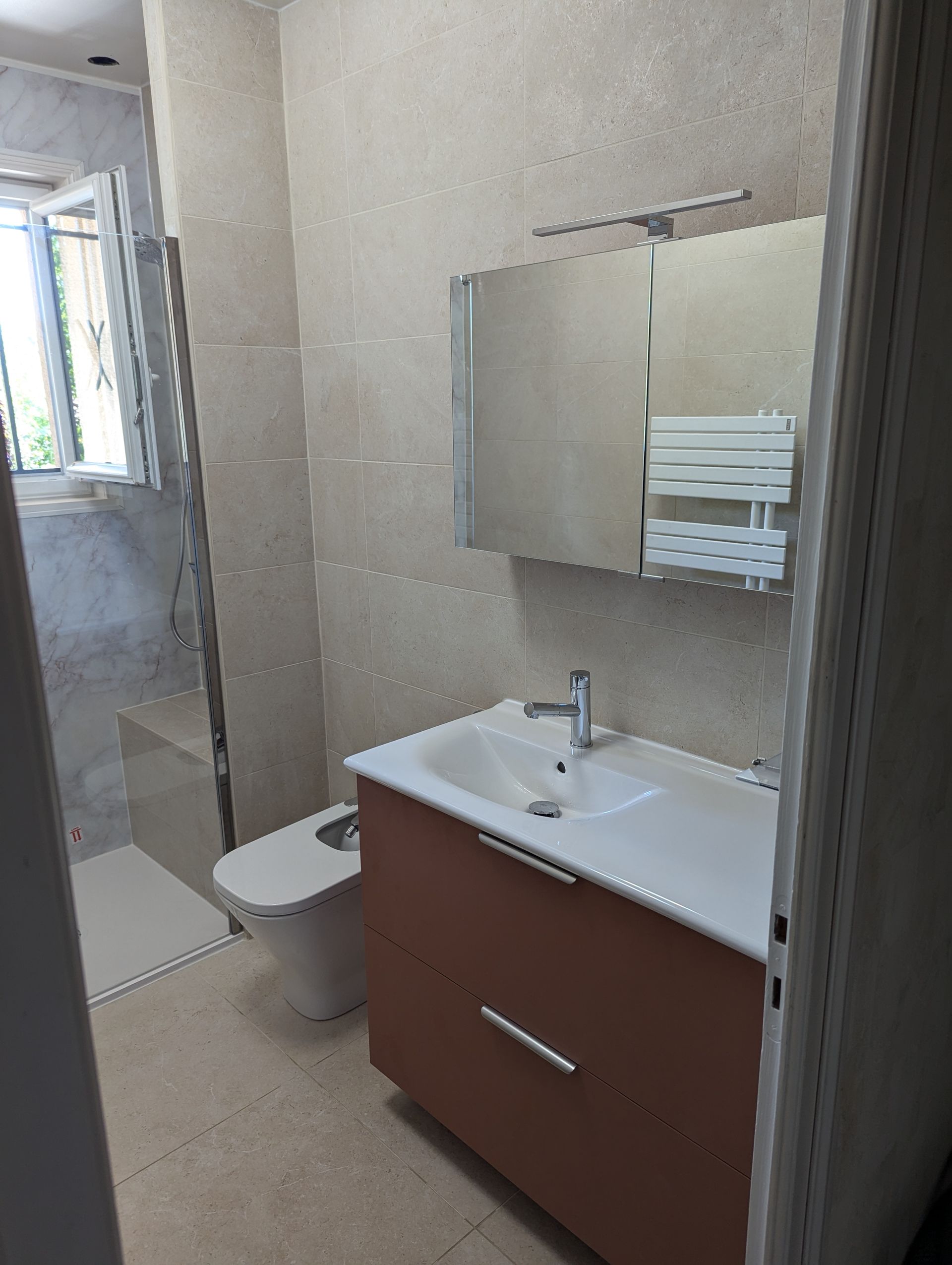 Une fois la pièce propre et rénovée, je passe à l'installation des mobiliers et des sanitaires, tels que :